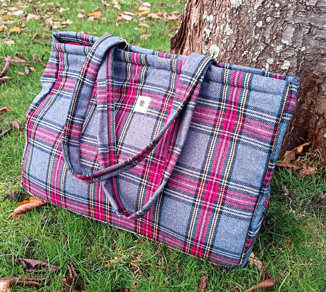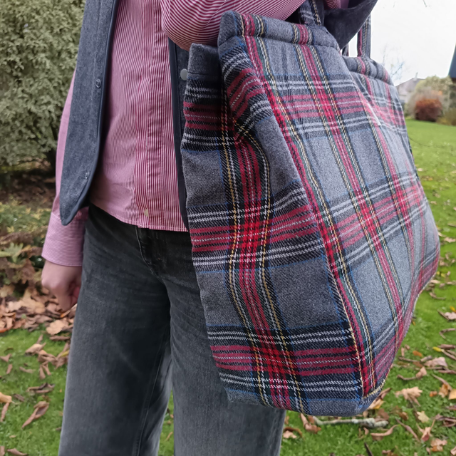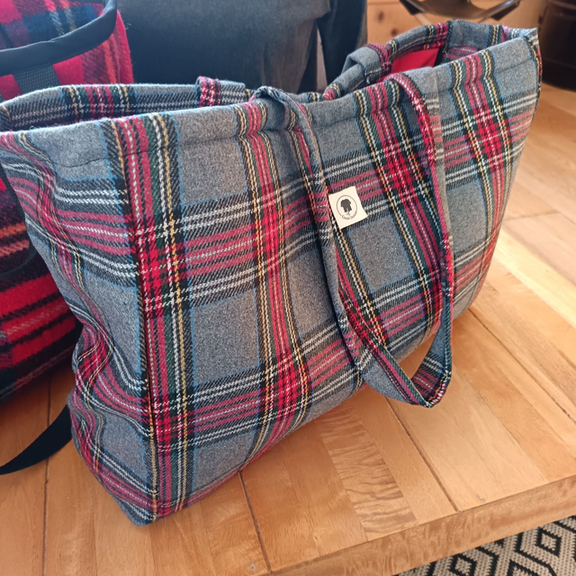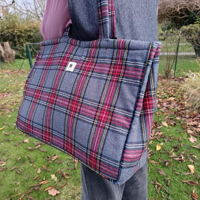 Il est composé à partir d’un tartan gris à rayures rouge, noir, jaune, vert, blanc, doublé et renforcé à partir d'un drap rouge. Il est complété d'une poche intérieur ouverte et d'un aimant pour le fermer.La hauteur des sangles permet de le porter sur l'épaule et/ou à la main.